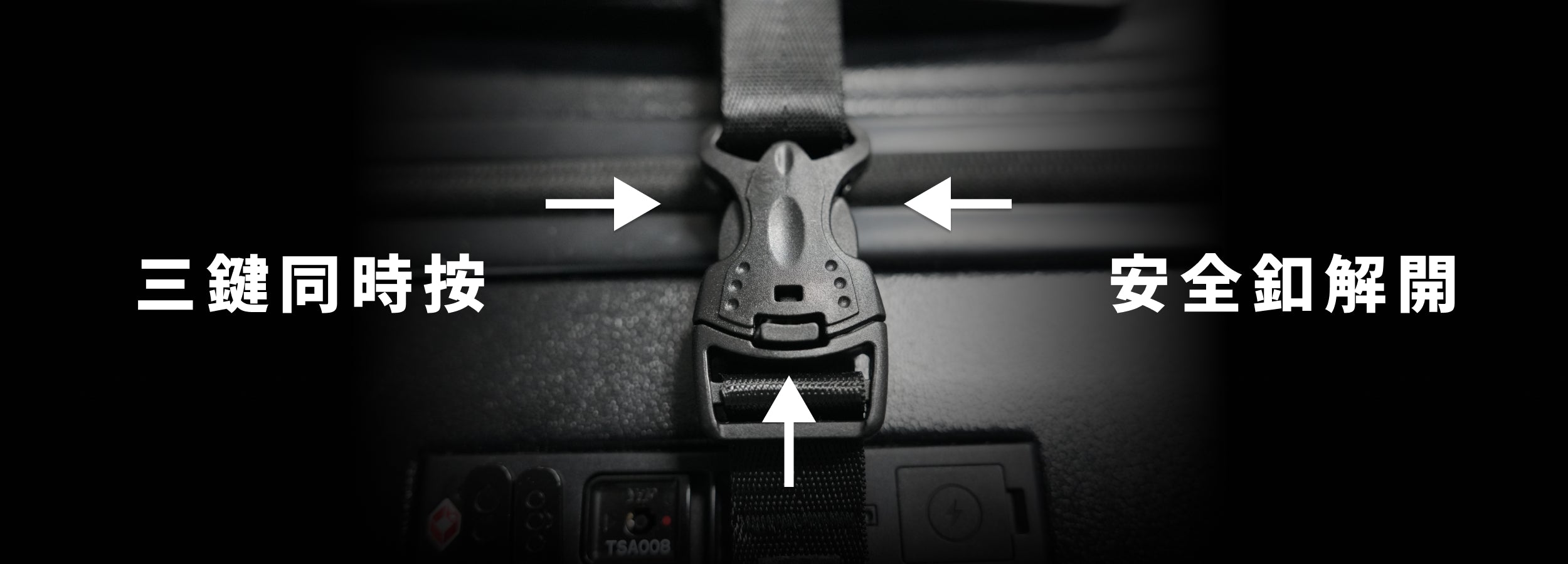 解釦方式:塑膠扣件按壓左右兩側按鍵, 同時按壓中間安全釦,即可開鎖