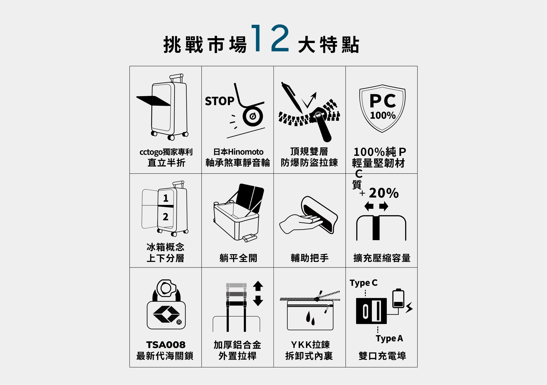 cctogo專利手把,TPU材質具高減震、抗拉力等特性,耐用不易降解老化,避免斷裂可能性。行李箱在裝重物下,亦通過高達 3,000 次的提拉測試。