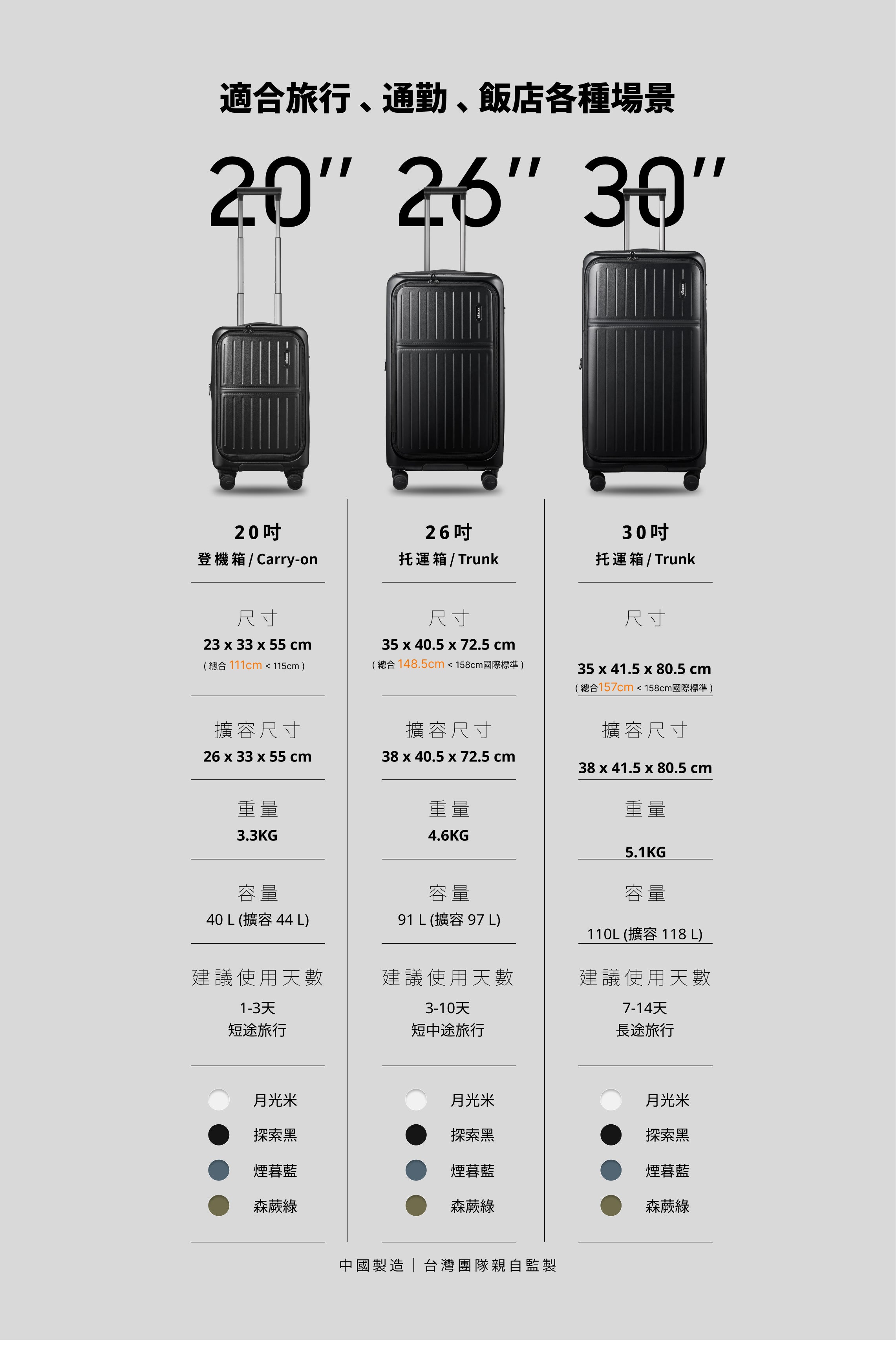30 吋與 26 吋無法互套,是我們經過使用者統計後的深思熟慮:大箱收納中箱的使用比例低,反而限制了中箱容量。為了讓 26 吋箱友也能享有最大使用空間,我們選擇放棄互套功能,專注提升實用性。不過別擔心,最常見的20 吋登機箱,依然可以輕鬆收納進26吋 與 30吋箱中,滿足收納需求。
