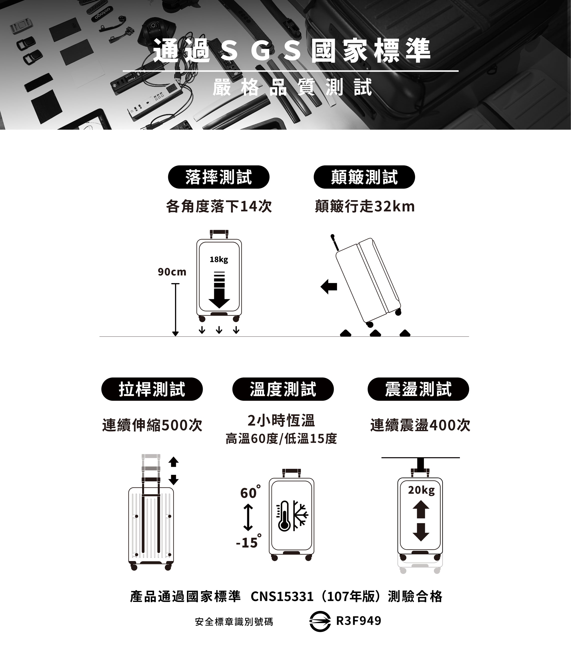 全系列皆通過滾筒實驗測試,模擬負重25KG情境下,行李箱在運輸與使用過程中可能的掉落、撞擊、翻滾等各種極端情況。即使經歷嚴苛衝擊測試,箱體依然保持完好無損,展現超強耐用性與結構穩定性。